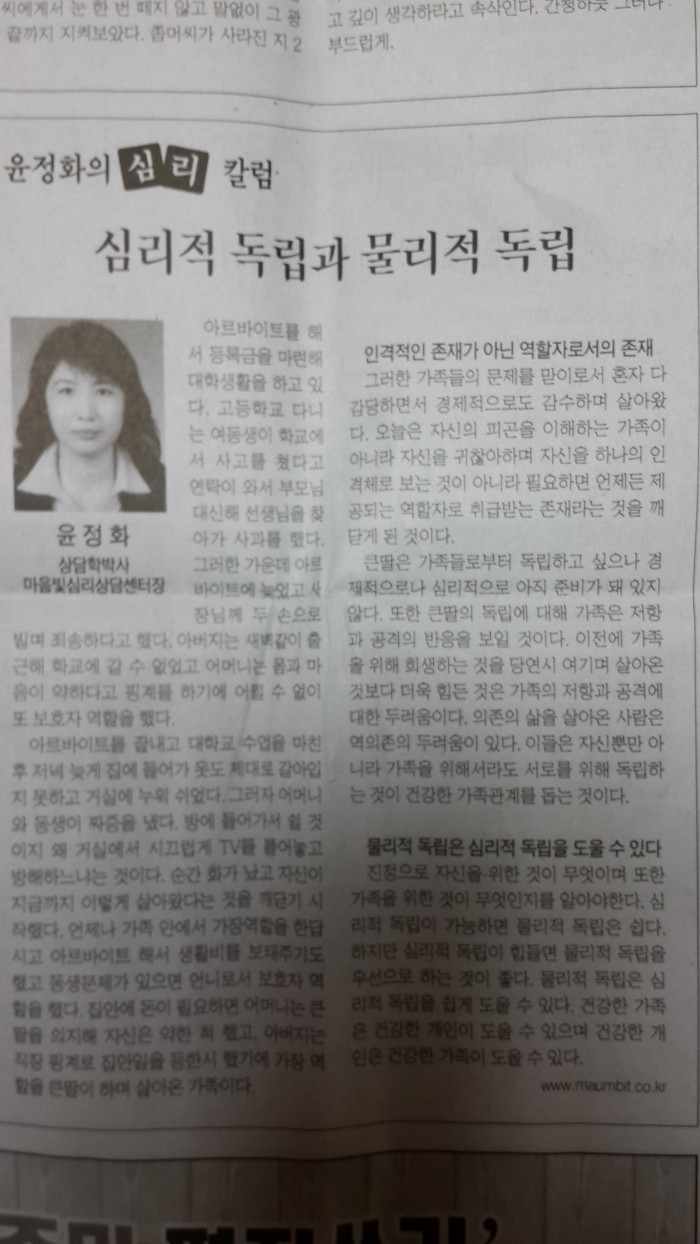 심리적 독립과 물리적 독립 페이지 정보 작성자 마음빛 작성일13-12-01 21:34 조회3,383회 댓글0건 이전글 다음글 목록 답변 본문 심리적독립 과 물리적 독립 댓글목록 등록된 댓글이 없습니다. 이전글 다음글 목록 답변